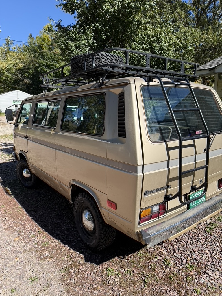 1987 Vanagon, SmallCar Performance 2.5 Subaru engine, and kit. Rebuilt transaxle built with Peloquin limited slip differential. New brakes all around. New front end ball joints all new. New brake primary, and secondary cylinders. VW rack, Oversize roof rack mounted with matching off road tire. Brown interior, Gold exterior. Email, call for details, or to schedule appointment to view in person.